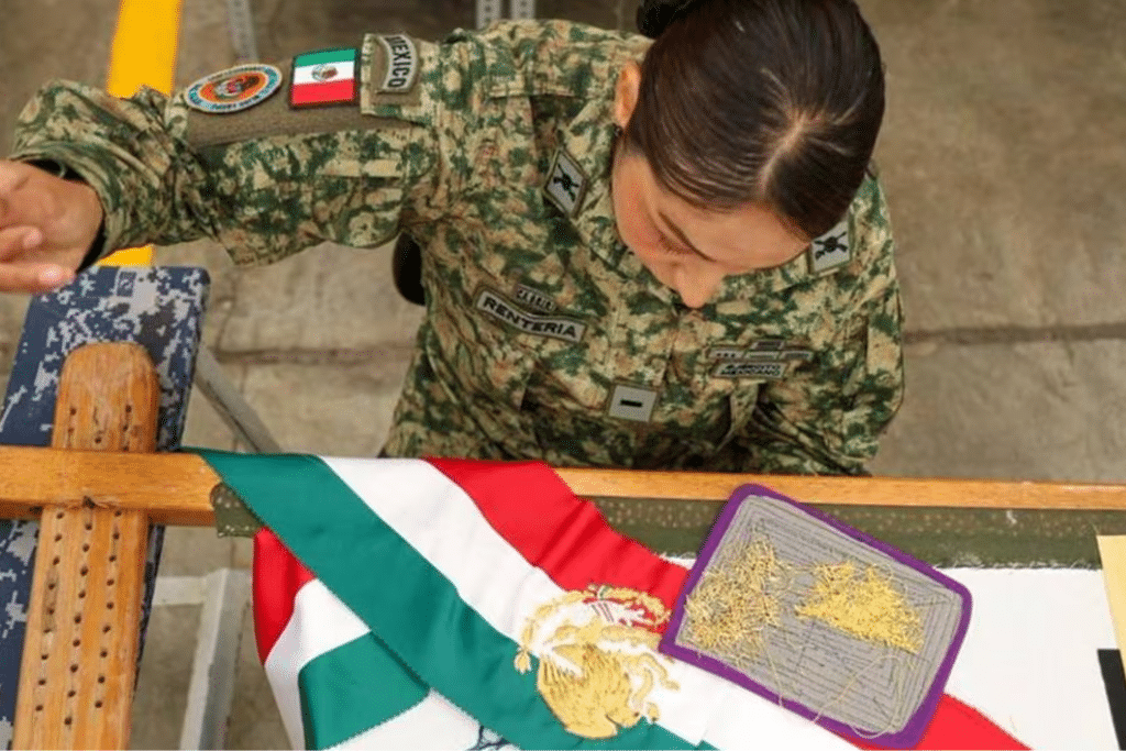 La responsable es Evangelina Rentería de la Cruz, una soldada Primera Auxiliar de la Secretaría de la Defensa Nacional (Sedena). Con un trabajo minucioso, Rentería es quien se encarga de bordar el escudo nacional en la banda presidencial, agregando un toque de orgullo militar y dedicación a este emblema.