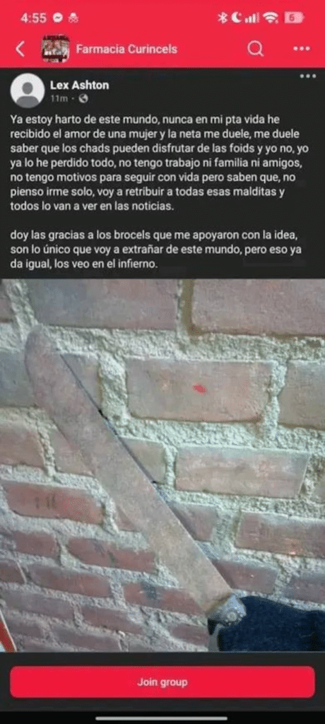 El perfil de Facebook asociado a Lex Ashton mostraba publicaciones con armas y mensajes de frustración por la falta de relaciones afectivas y sociales. Según reportes, el joven participaba en un grupo llamado Farmacia Curincels, un espacio de memes y desahogo vinculado a la comunidad incel.